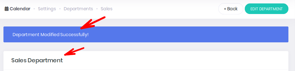 You will then be brought back to information page for that Department. A notice will inform you “Department Modified Successfully”. You will see the changes you made displayed below, in the case of our example here the Department name is now “Sales” and no longer “Sales & Marketing”.