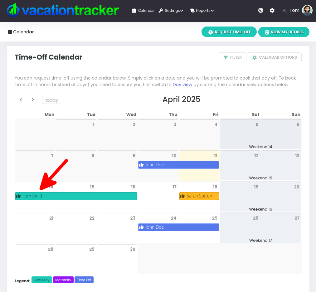 Firstly, from your VacationTracker Account Dashboard simply locate your time-off on the calendar displayed and click on it. So, in this example we are operating as employee Tom Smith, so we click on Tom Smith on the calendar, as shown below: